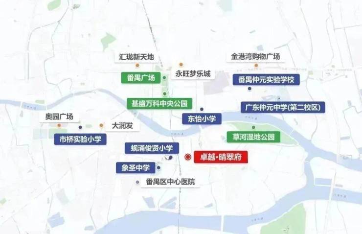 位于番禺区桥南板块,紧邻市桥河6公里精英河岸线,坐拥草河湿地公园、星海公园等四大滨水生态带。
