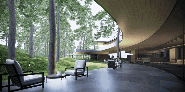 小区配套:社区内部配建一所九年一贯制学校和一所幼儿园,1000平下沉式精致会所,从效果图可以看出,这个上千方的会所,香槟色金属质感外立面,辅以大面积落地玻璃,充满了现代感。