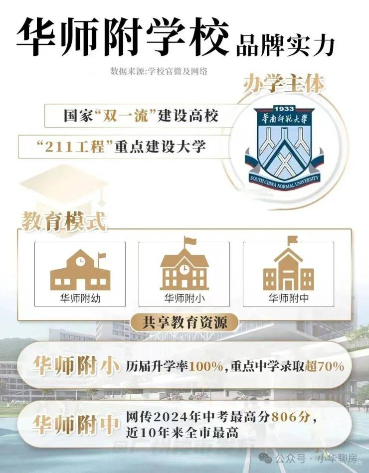 华师附是华南师范大学附属学校,该校是双一流、首批国家211工程大学,有强大的教育背景和资源。华师附小升学率100%,重点中学录取率超70%;