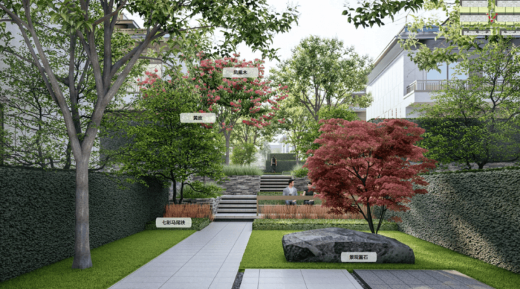 项目打造体验极致的意境生活,在静谧观景区,绿树浓荫,花木成趣,一处处诗意与绿意的交融的场景,目之所及,皆是风景。