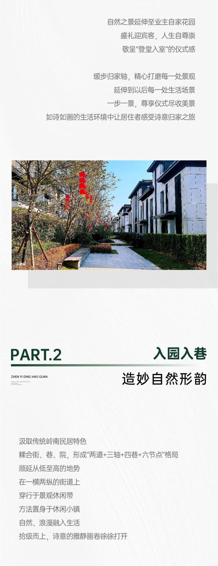在空间布局方面,【臻院】园林汲取传统岭南民居群体聚落的特点,以坊巷为型,再以中式礼序为制,形成“两道+三轴+四巷+六节点”格局,为业主找回久违的邻里间亲密、和谐美善的居住氛围。