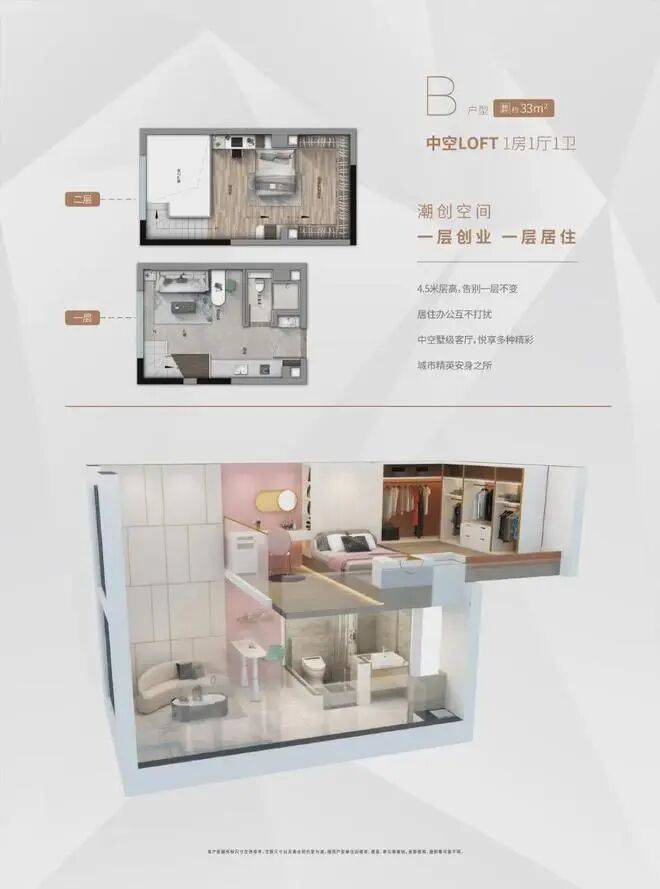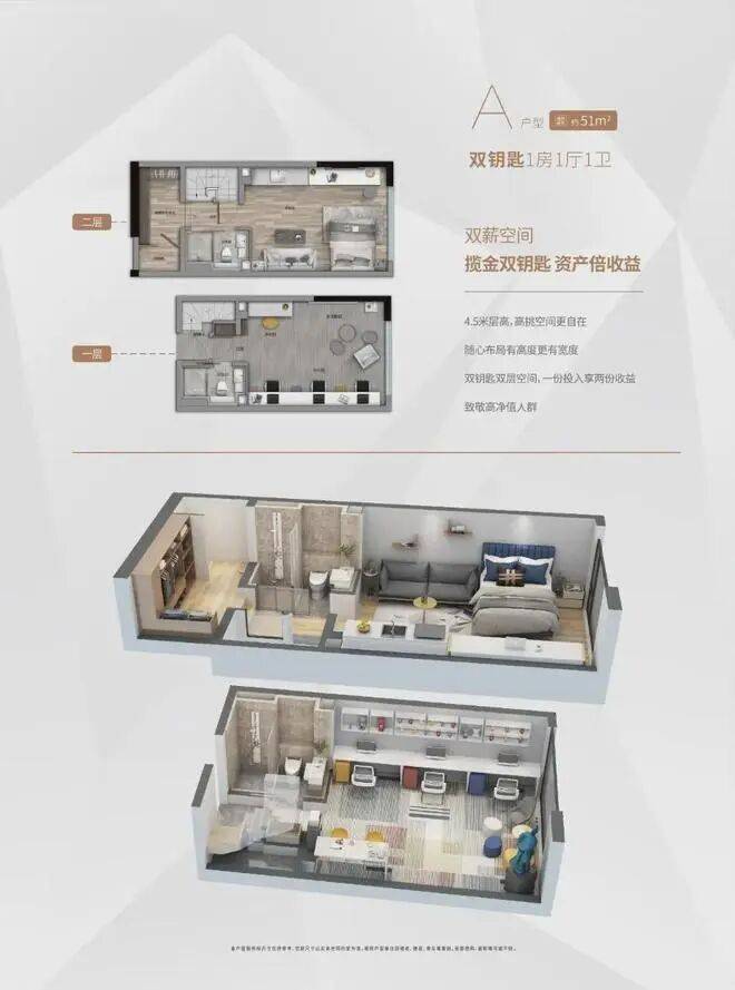 公寓部分规划了3栋21层高楼栋,4梯16户loft设计,共推出288套房源,户型层高4.5米,为精装交付。