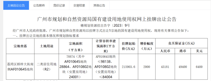 2023年4月,广东建工联合体以21.6亿底价竞得桥梓大街南侧地块,折合楼面价2.2万/平。