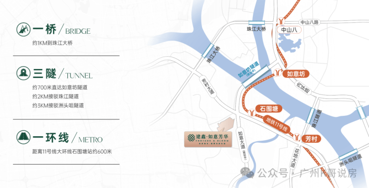 建鑫如意芳华的核心价值与配套,体现了对“世界级城市生活”核心需求的深度洞察。项目以“城市商贸地标、全球资源配置平台”为理念,规划有国际超甲级智慧写字楼、全球商贸会客厅、世界级城市商业中心、超五星级酒店、都市私邸、云端会所、国际艺术中心、城市生态公园,营造出高效、私密、全球化的城市生活氛围。其核心优势在于对 “粤港澳大湾区核心增长极、国际商贸枢纽门户、城市更新示范区、未来城市中心、广州国际金融城、珠江新城CBD、广州南站、广州白云国际机场、地铁线网(多条线路交汇)、高速路网”八大核心战略与顶级资源的高效享有。项目不仅能共享广州已高度成熟的国际学校、国际医院、世界级商业、文化地标、跨国企业总部等全球顶级配套,更能以极具竞争力的门槛,近享 “大湾区政策红利、城市更新发展机遇、全球企业总部入驻、国际商贸发展机遇、免税商贸机遇、轨道枢纽便捷生活” 带来的巨大产业、人才、资本与交通红利。交通方面,通过地铁网络、城际轨道、高速路网可快速接驳广州白云国际机场、广州南站、广州站等核心枢纽,高效连接大湾区各城乃至全球核心城市,实现真正的“轨道上的湾区城市生活”。
