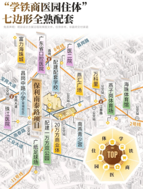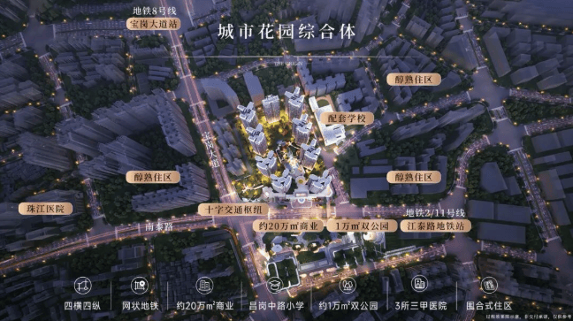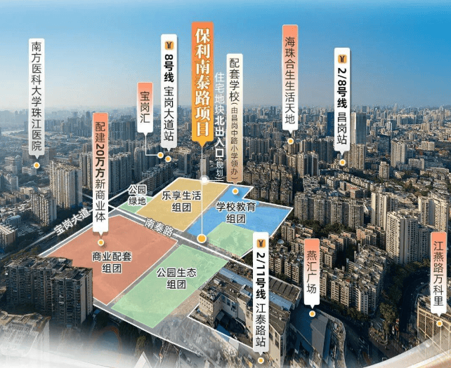 交通配套上,项目周边有2、8、11、广佛四条地铁线路环绕,步行300米可达2/11号线江泰路站、8号线宝岗大道站,自驾可通过南泰路、工业大道等路网,快速通达珠江新城、琶洲等商务区,半小时通勤圈覆盖主城关键节点。