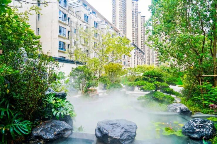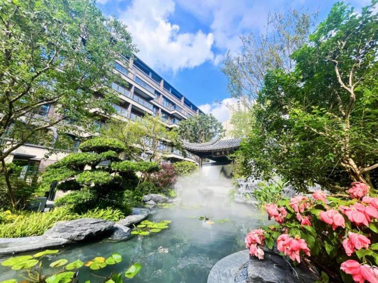 借助原生坡地地貌,打造约4万平方米的“云山森境”主题园林。园区内规划林溪剧场、云山书院、岩石花园、无边际泳池及全龄活动乐园。园林设计强调参与性与叙事性,引入雾森系统与夜光跑道,将白云山景借入园中,营造出都市中罕有的沉浸式山居体验与家庭社交场。