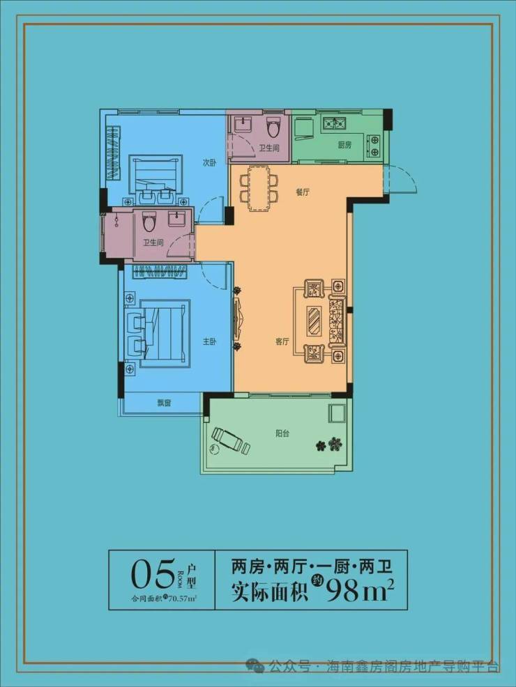 建筑面积:70平米,实得面积98平米南北各一个卧室