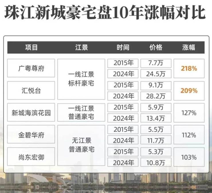 像同在珠江新城东区,占据一线江景的标杆顶豪盘,不仅总价更高,涨幅也远远甩开其它没有江景或者品质一般的豪宅盘。