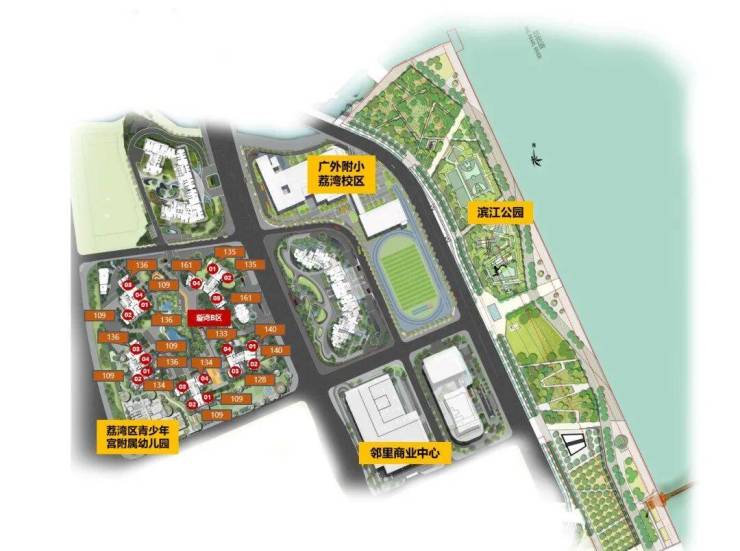 教育方面,项目配建12班幼儿园与30班广外附属荔湾小学(广外教育集团成员校),周边覆盖真光中学、培英中学等优质资源,形成“出家门即入校门”的全龄教育体系。