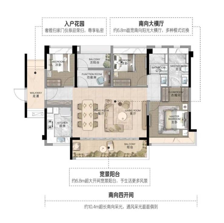 建面约127㎡3+1房2厅2卫,为城市改善人群特别定制。贴心规划多功能灵动空间,可作书房、兴趣室或未来孩子房,一房多用,为未来生活预留无限弹性。约6.8米宽南向大横厅,超大尺度为家庭聚会、朋友宴请、亲子游戏提供了充足的空间。家人围坐畅谈,孩子自在奔跑,其乐融融的景象在此自然上演。精心设计独立入户花园,是归家的第一道风景,更是归家情绪的缓冲区,让居者从容完成从“社会角色”到“家庭角色”的转换。