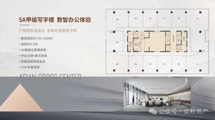 【主力产品】:约150-2600㎡ 5A甲级写字楼、约160-380㎡定制总裁公馆
