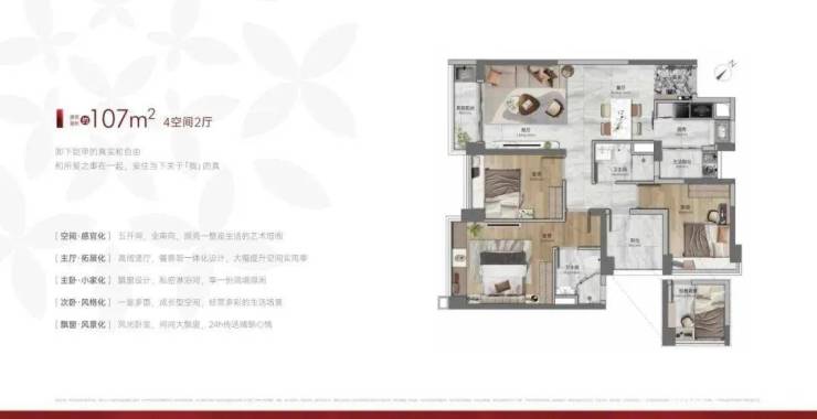 建面107平四房两卫,五开间朝南,经典竖厅设计,餐客厅一体化,每间房都有赠送大飘窗,总价420-470万左右。