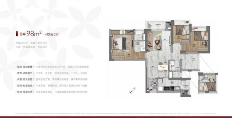 建面98平四房两卫,全屋智能化铺设,大主卧设计,双阳台,总价400-450万左右。