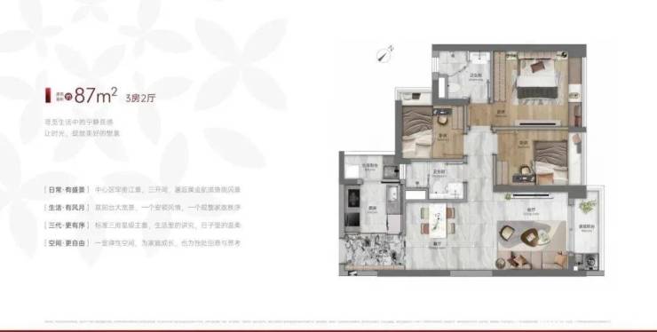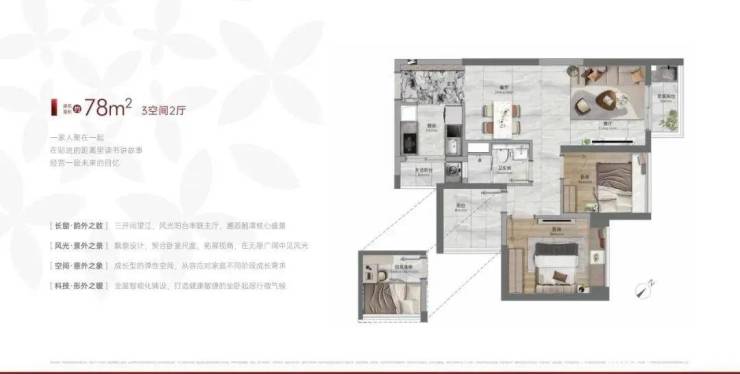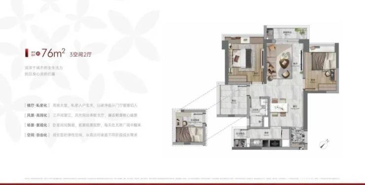 建面76-78平三房一卫,三开间望江,私密入户玄关,带生活阳台,主卧次卧都可望江,总价280万起!
