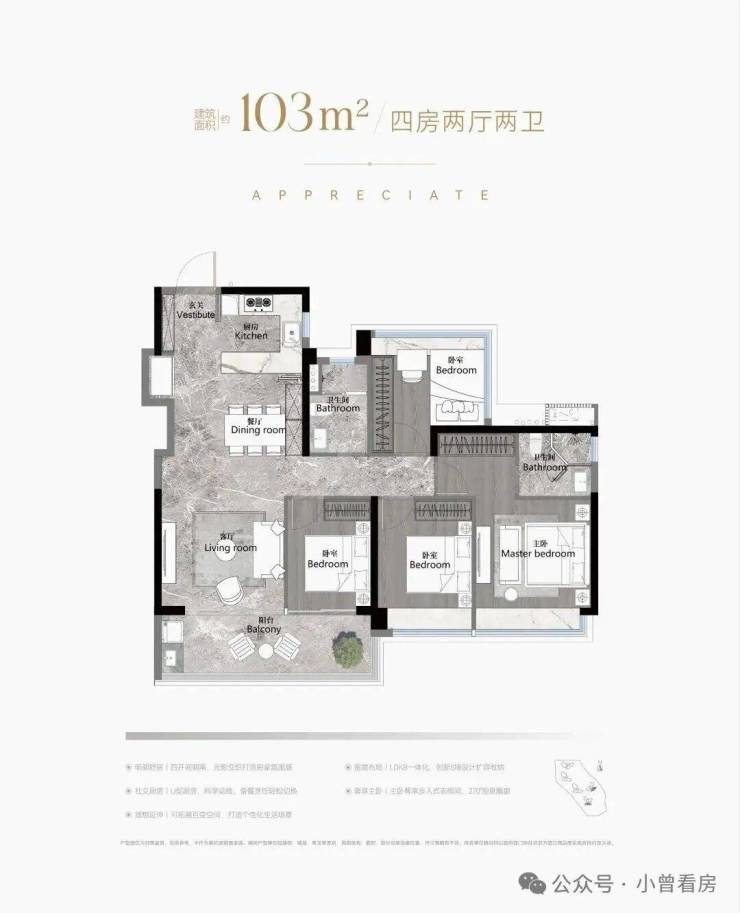 建面188平四房三卫,据说使用率超110%,双主套分居两侧,三代同堂的话,可以很好地避免两代人不同的休息时间干扰互相,入户独立玄关为还有宽裕的储蓄空间,能安置酒柜等,更有南北对流双阳台+中西双厨,主卧超宽三面采光等,不愧是终极改善不二之选,9米长跑道阳台,约34平豪华主卧,270度环幕飘窗