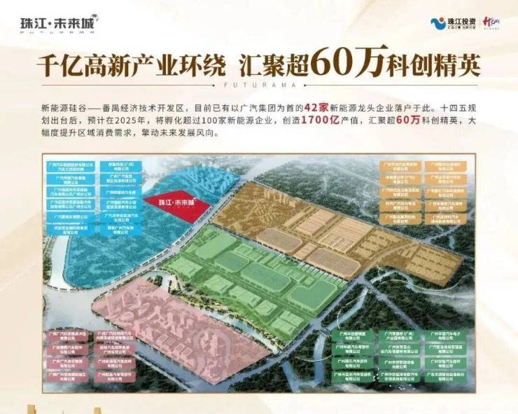 项目位于千亿汽车城板块核芯:周边以广汽集团领衔,已有42家新能源企业落户,2025年将超100家,汇聚10万+科创精英,60万+高薪企业人才。
