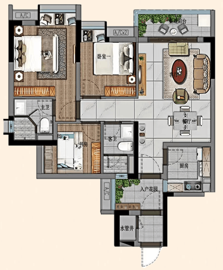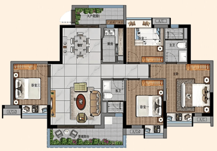 双阳台+阔绰双厅南北通透,四开间朝南,套房式主卧更多生活仪式感