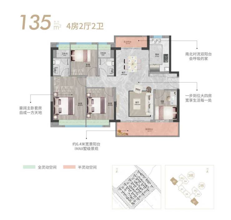约6.4米墅景阳台+双阳台+阔绰双厅南北通透,四开间朝南,套房式主卧更多生活仪式感