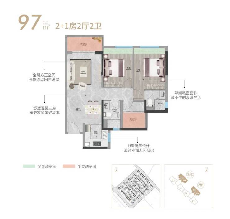 全明方正竖向双厅,U型厨房更多储藏空间,私享套卧浪漫生活