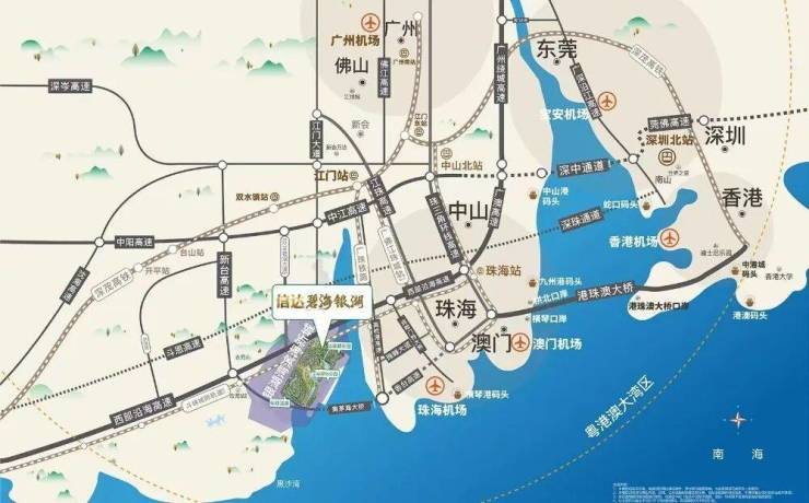 緊密連接港珠澳大橋、深中通道與廣佛都市圈北通道,緊鄰灣區第三大高鐵站江門站,享受黃茅海開通利好,速达港澳直通江门,輻射灣區五大機場,海運直達香港市中心,實現與周邊城市群快速互通。