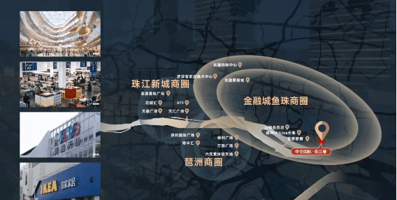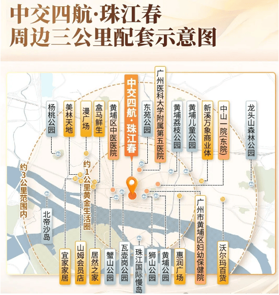 生活配套:商业配套十分完善,3km 半径内分布着宜家家居、山姆会员店、美林 M・LIVE 天地购物中心等,同时还有鱼珠时光、华润万象系商业配套。30 分钟内可尽享珠江新城商圈、天河城 - 太古汇商圈等世界级商圈的奢华配套。医疗方面,紧靠中山一院东院、广州医科大学附属第五医院、广州市黄埔区中医院等多家优质大型三甲医院,为居民的健康保驾护航。此外,项目周边自然景观优美,蟹山公园、瓦壶岗公园、狮山公园约 10 万㎡公园环绕,还有 1.2 公里滨水景观长廊,打造樱花水岸及夜光跑道,为居民提供了休闲健身的好去处。