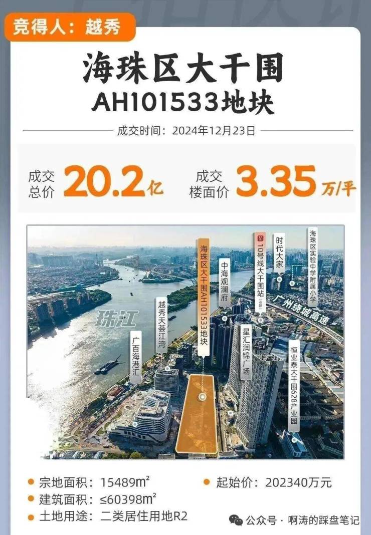 2024年12月23号,海珠大干围地块被越秀以20.23亿元拿下,楼面价为33501元/㎡。
