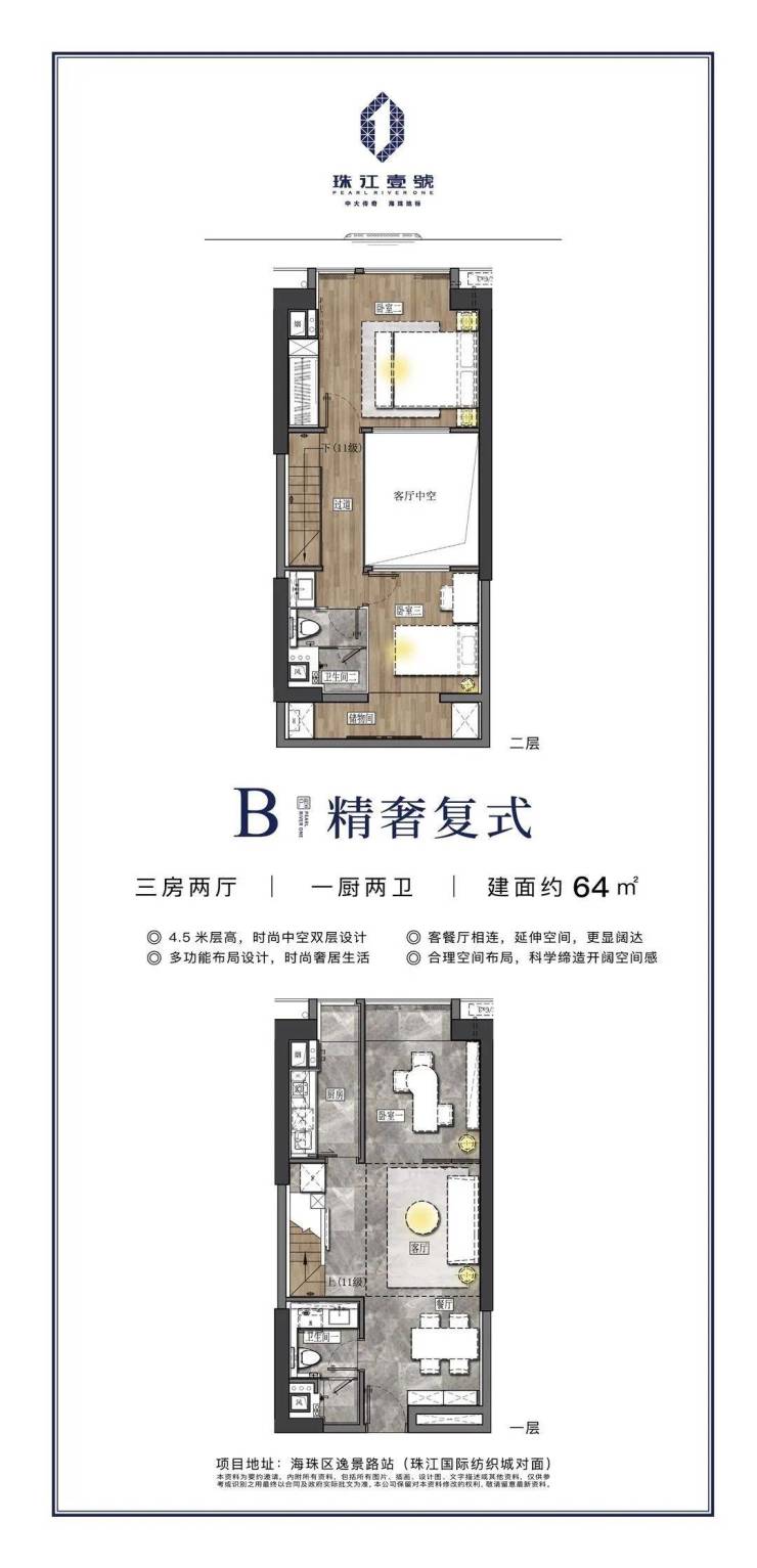 4.5米中空挑高设计,视野开阔不压抑;开放式厨房、超宽飘窗、两房左右分开布局、动静分区、每一个细节都力求给住户最舒适的入住感受。
