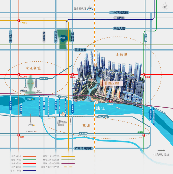 奠基启幕期,定调金融标杆。2018年二期启动建设,广州城投抢占金融城起步区绝版临江地块,依托“珠金琶”黄金三角红利,规划打造集高端写字楼、江景大平层、商业配套于一体的综合体[3][5]。7地铁环伺,近4号线车陂南站、5号线科韵路站,多维路网通达三大CBD,奠定“江景+产业+枢纽”三重顶豪基因[7]。