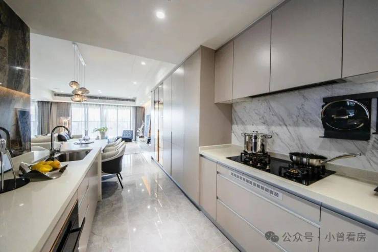 平滑细腻的视觉感受,与客厅的空间设计、材质相统一。为了使厨房空间更具观赏性,设计师将烟机、冰箱、洗碗机隐藏,厨房整体线条更加流畅。