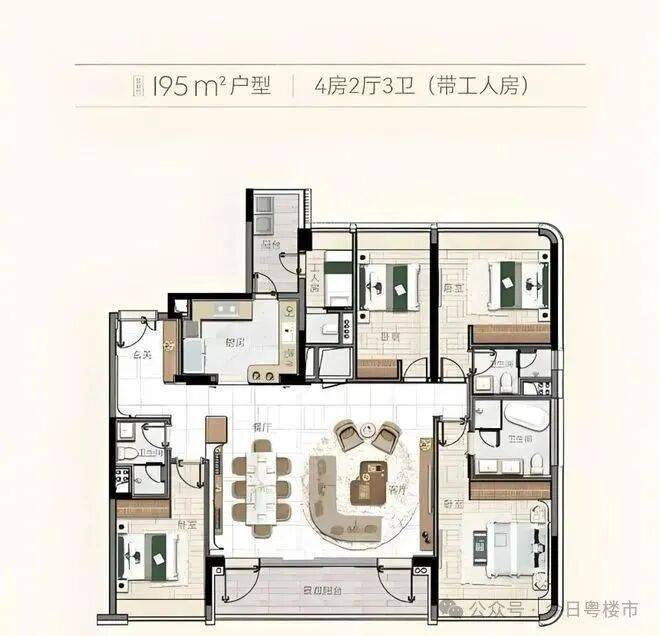 195㎡四房更宽敞,客厅餐厅连在一起,过年亲戚来聚餐都不挤;每个房间都不小,孩子有自己的学习空间,老人住着也舒服。