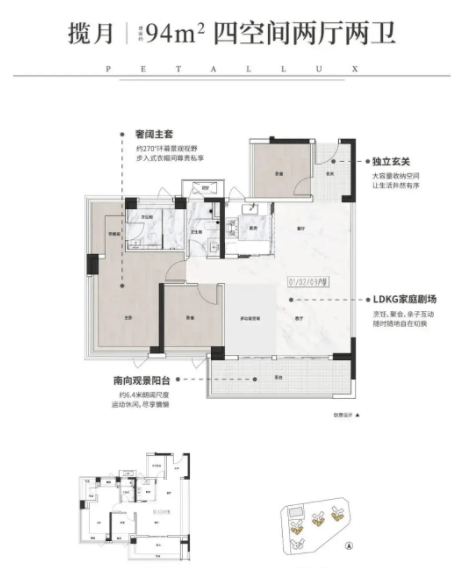 94㎡户型升级为四房两厅两卫,同样配置独立玄关,LDKG一体化设计让餐客厅与厨房连通,空间显得开阔通透。最吸引人的是约6.4米的超大阳台,既可以作为生活晾晒区,也能开辟出休闲小角落。主卧全明通透,搭配全景飘窗,居住舒适度较高,适合二胎家庭或需要预留长辈房的购房者。
