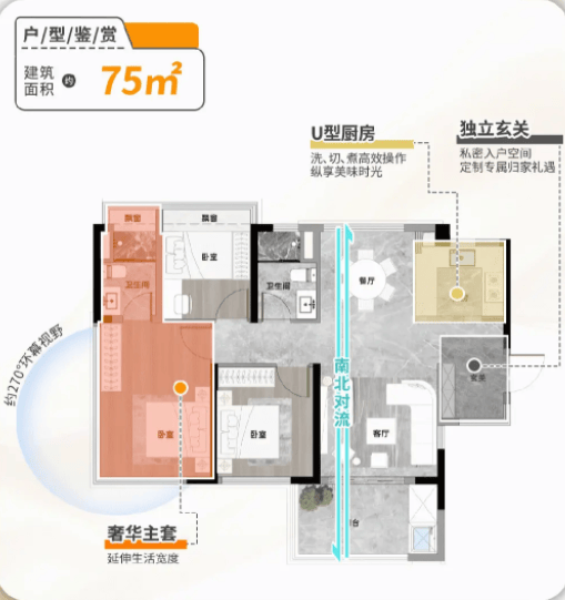 其中75㎡做到了三房两厅两卫,进门有独立玄关,可改造为储藏室增加收纳空间,厨房采用实用的U型设计,操作动线合理。主卧为套房设计,带有独立卫浴,部分户型还能享受270°观景视野,南北对流的格局让室内通风采光都不错,很适合刚需小家庭。