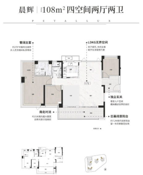 108㎡则是改善型主力户型,四房两厅两卫的格局搭配约15米南向超大面宽,采光面堪比大户型产品。餐客厅一体化设计,连通约7.2米的南向阔景阳台,站在阳台就能欣赏社区园林或城市景观。主卧配备步入式衣帽间和独立卫浴,细节设计贴心,无论是多人口家庭居住还是日常待客,都能满足需求。