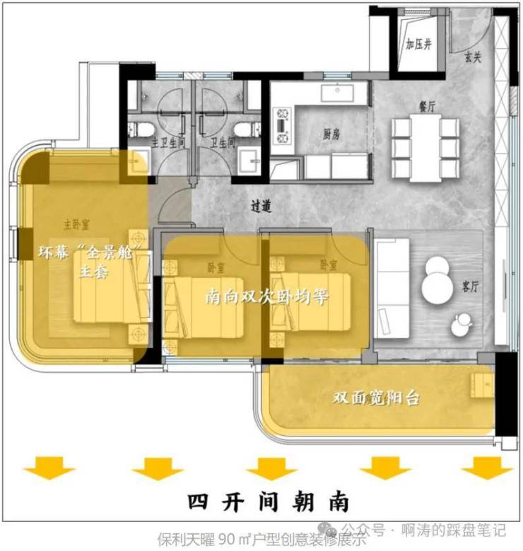 作为珠江新城首个90㎡新规三房两卫户型,保利天曜的90㎡户型可谓亮点十足:近6m的双面宽阳台连通客厅和次卧,成为除客厅外的“第二公区”。南向双次卧面积均等实现居住平权,并且可改造为超35㎡的大方厅,承载更多的生活场景。