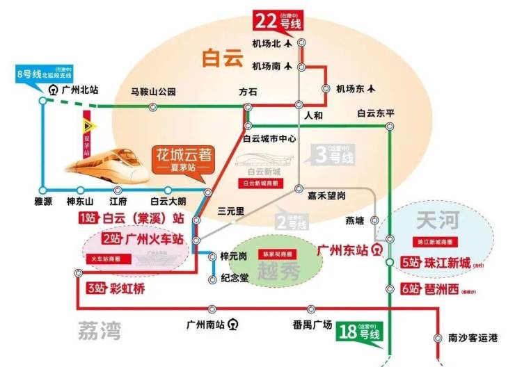 乘8号线北延段支线,迅达越秀、花都,串联广州北站和白云棠溪TOD。