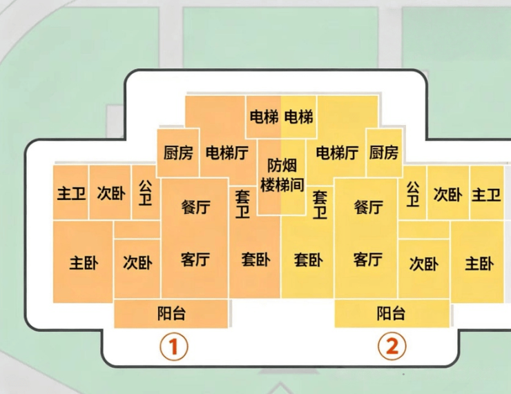 这两栋都是连体楼,四梯腿是边户,四梯腿是中间户,户户之间是隔墙,没有270°L型飘窗。