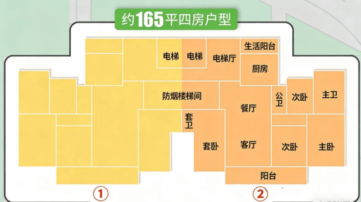 再大一点则去到165㎡四房三卫,只有#5栋两条梯腿。