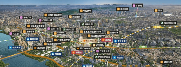 项目自身没有配建学校,但周边名校环伺,3km直线范围内包含广州市五中附属初级中学(省级)、广州市第41中学(省级)、宝玉直实验小学(光大校区)、江南外国语学校、工业大道中小学、红棉小学、海富小学、南燕小学、培红小学等9所学校环伺,拥有完善的区域教育体系。
