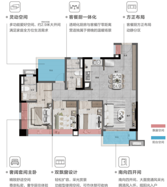 开间全南向:建筑面积约84㎡2房2厅1厨2卫+1灵动空间