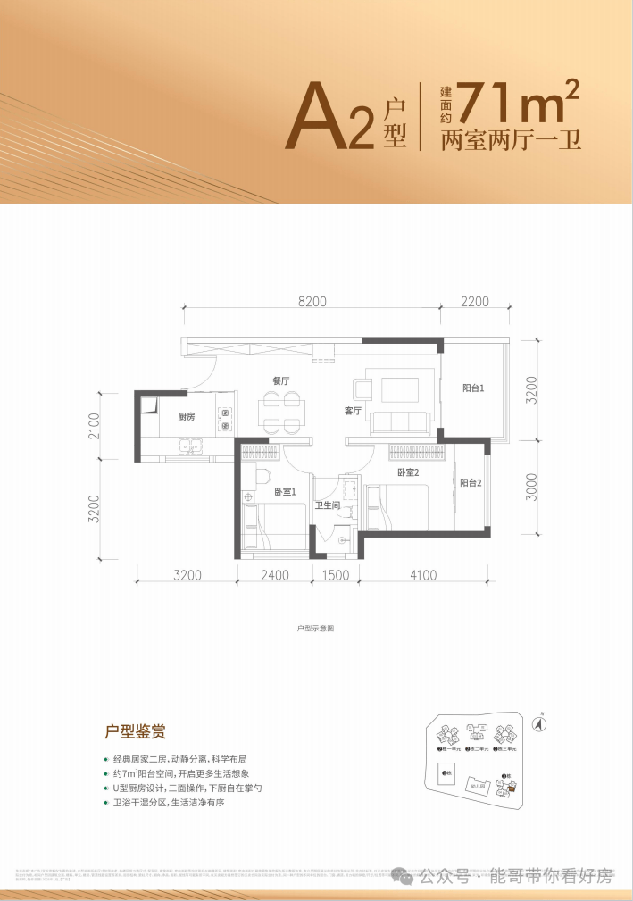 71㎡的2房2厅1卫,设计的是竖厅格局,客厅3.2米开间,进深8.2米,2个卧室分别做到了主卧12.5㎡/次卧9.12㎡(包含墙体飘窗),得房率约88%(包含赠送),东南朝向。