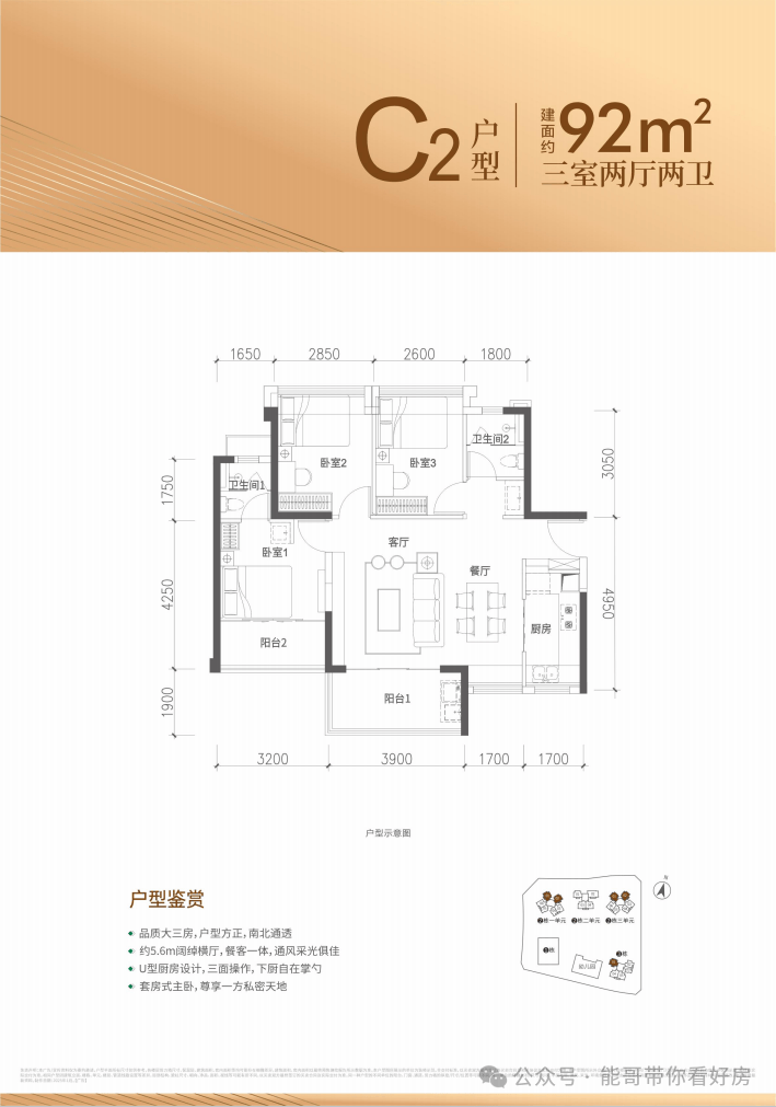 92㎡的3房2厅2卫,设计的是横厅南北通透格局,客餐厅5.6米开间,四开间朝南,3个卧室分别做到了主卧12.43㎡/次卧9.22㎡/次卧8.84㎡(实测面积,去掉墙体飘窗),得房率约96.08%(包含赠送),阳台主朝西南或东南向。靓点都不需要睡飘窗。