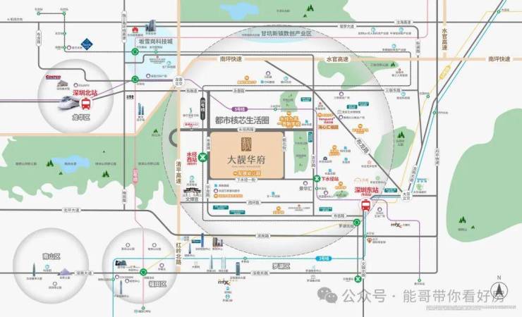 大靓华府,位于龙岗区吉华街道华龙路与水径路交汇处东南侧,地处布吉水径板块,项目紧邻清平高速入口,30分钟直达福田CBD及东莞松山湖,是深莞融合的桥头堡。周边规划约24万平方米城市更新项目,包括星河旧改等,未来将形成“工业上楼+生态居住”的复合社区,但现阶段以工业区和待开发地块为主,城市界面升级需5-8年。此外,项目西侧毗邻银湖山郊野公园,生态资源优越,是深圳低密度生活区的一部分。