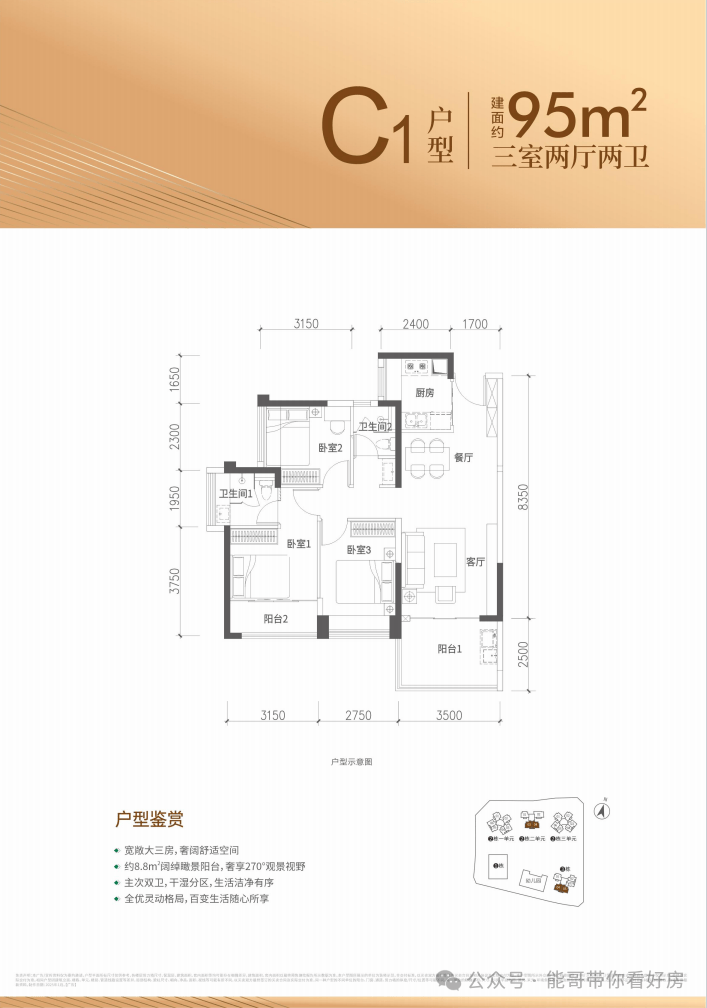 95㎡的3房2厅2卫,设计的是经典竖厅格局,客厅3.5米开间,进深8.35米,三开间朝南,3个卧室分别做到了主卧13.8㎡/次卧10.31㎡/次卧9.13㎡(包含墙体飘窗),得房率约90%(包含赠送),西南或正南朝向。
