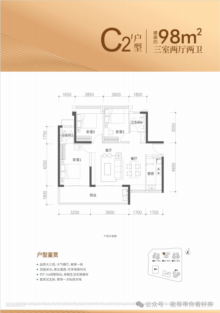 98㎡的3房2厅2卫,设计的是横厅南北通透格局,客餐厅5.6米开间,四开间朝南,3个卧室分别做到了主卧13.6㎡/次卧10.4㎡/次卧9.49㎡(包含墙体飘窗),得房率约90.2%(包含赠送),阳台主朝正南向。