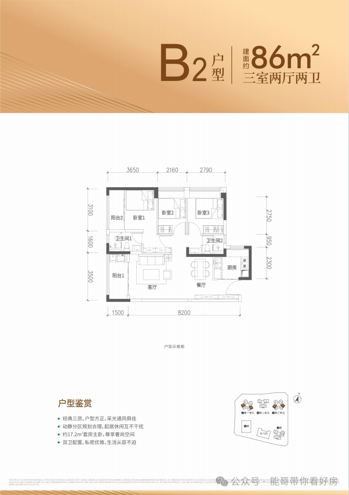 86㎡的3房2厅2卫,设计的是竖厅格局,客厅3.5米开间,进深8.2米,三开间朝南,3个卧室分别做到了主卧13.59㎡/次卧7.95㎡/次卧6.06㎡(实测面积,去掉墙体飘窗),得房率约88.08%(包含赠送),东南或西南朝向。