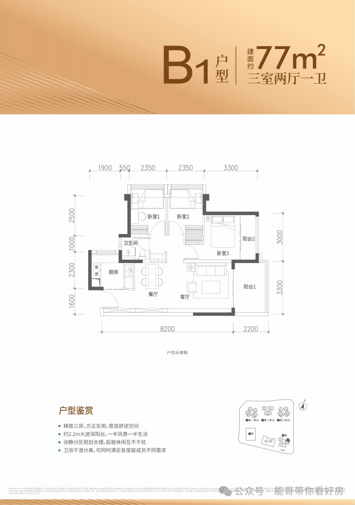 77㎡的3房2厅1卫,设计的是竖厅格局,客厅3.3米开间,进深8.2米,3个卧室分别做到了主卧11.3㎡/次卧7.28㎡/次卧7.28㎡(包含墙体飘窗),得房率约88.31%(包含赠送),东南朝向。