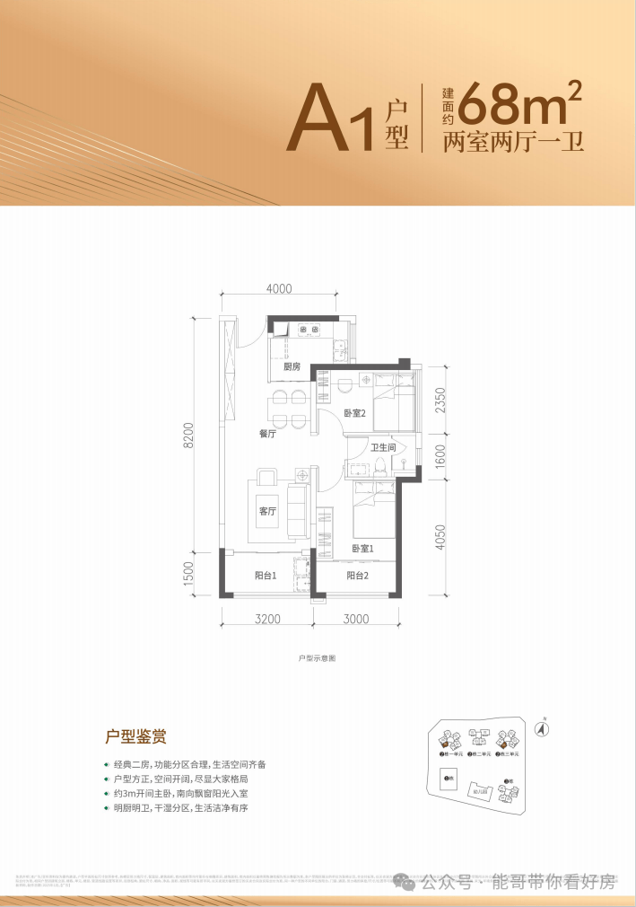 68㎡的2房2厅1卫,设计的是竖厅格局,客厅3.2米开间,进深8.2米,,2个卧室分别做到了主卧11.55㎡/次卧7.74㎡(实测面积,去掉墙体飘窗),得房率约88%(包含赠送),西南朝向。