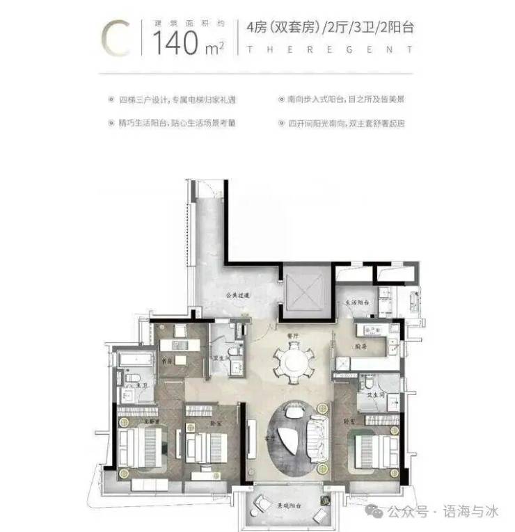 『天启』组团面积约140-250㎡环幕临江大平层,坐拥江景第一排,眺望小蛮腰,享500米宽阔无遮挡江景视野,并邀请三大全球知名设计大师倾力打造,并配备12大国际一线品牌交标,专梯专户四房双套房设计,世界灵感前沿作品礼献广州!