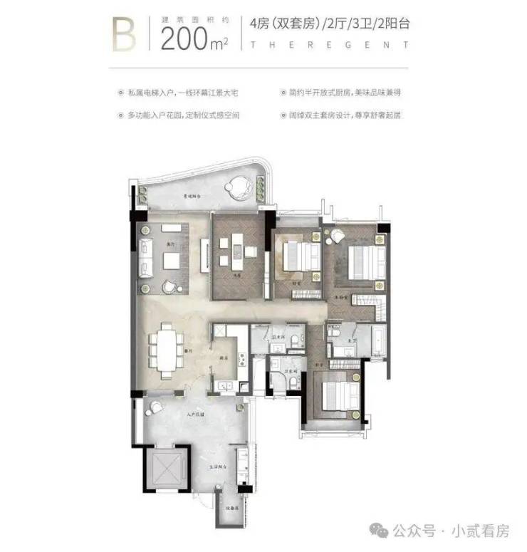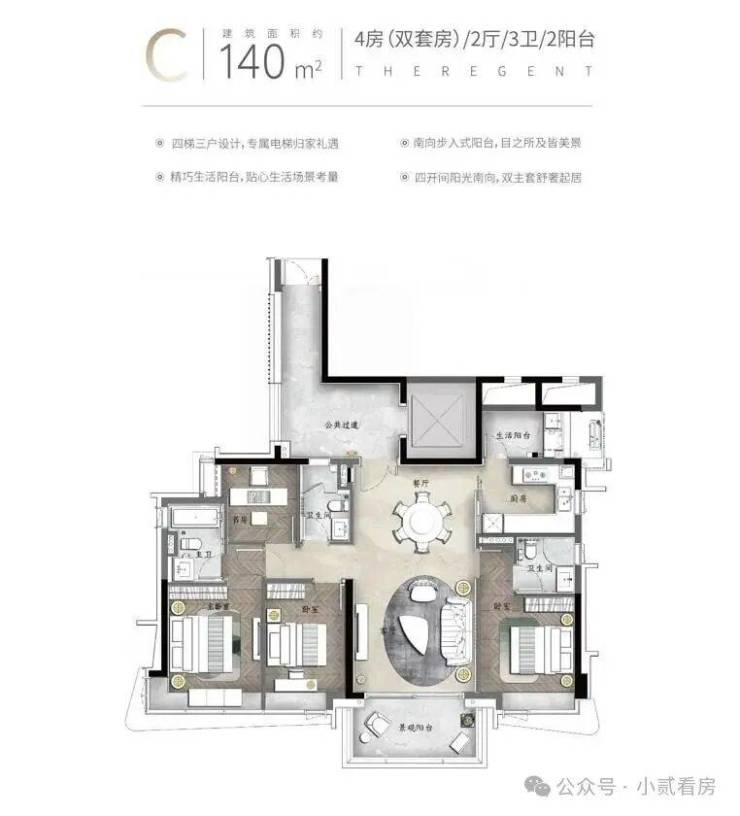 产品亮点:私家电梯入户、约3.4米层高、动静分区南北对流、约6.8米挑空餐客厅、中西双厨、三套房设计、部分房间带阳台设计