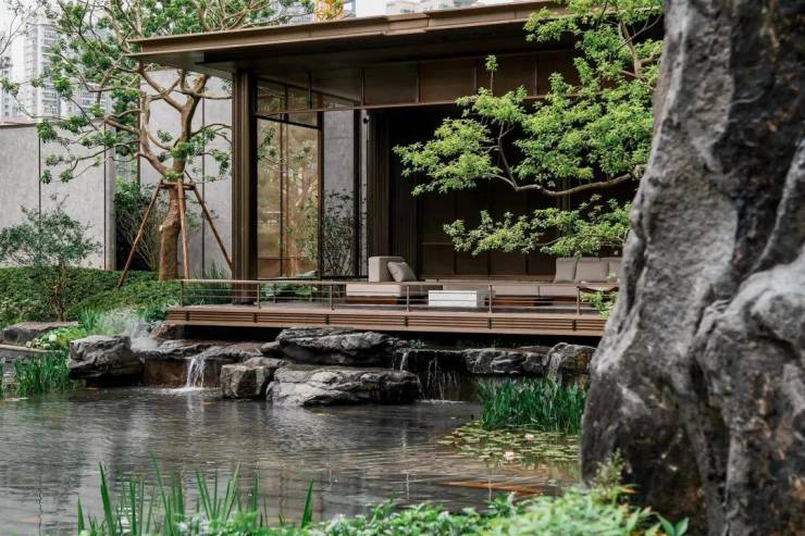 园林采撷《梁园飞雪图》画中意境及神韵,引入曲水飞虹、万倾涵碧、松间、观澜、林隐等景观组团,再现“枯山水”东方禅意画卷,缔造具有东方韵味的新中式之美。